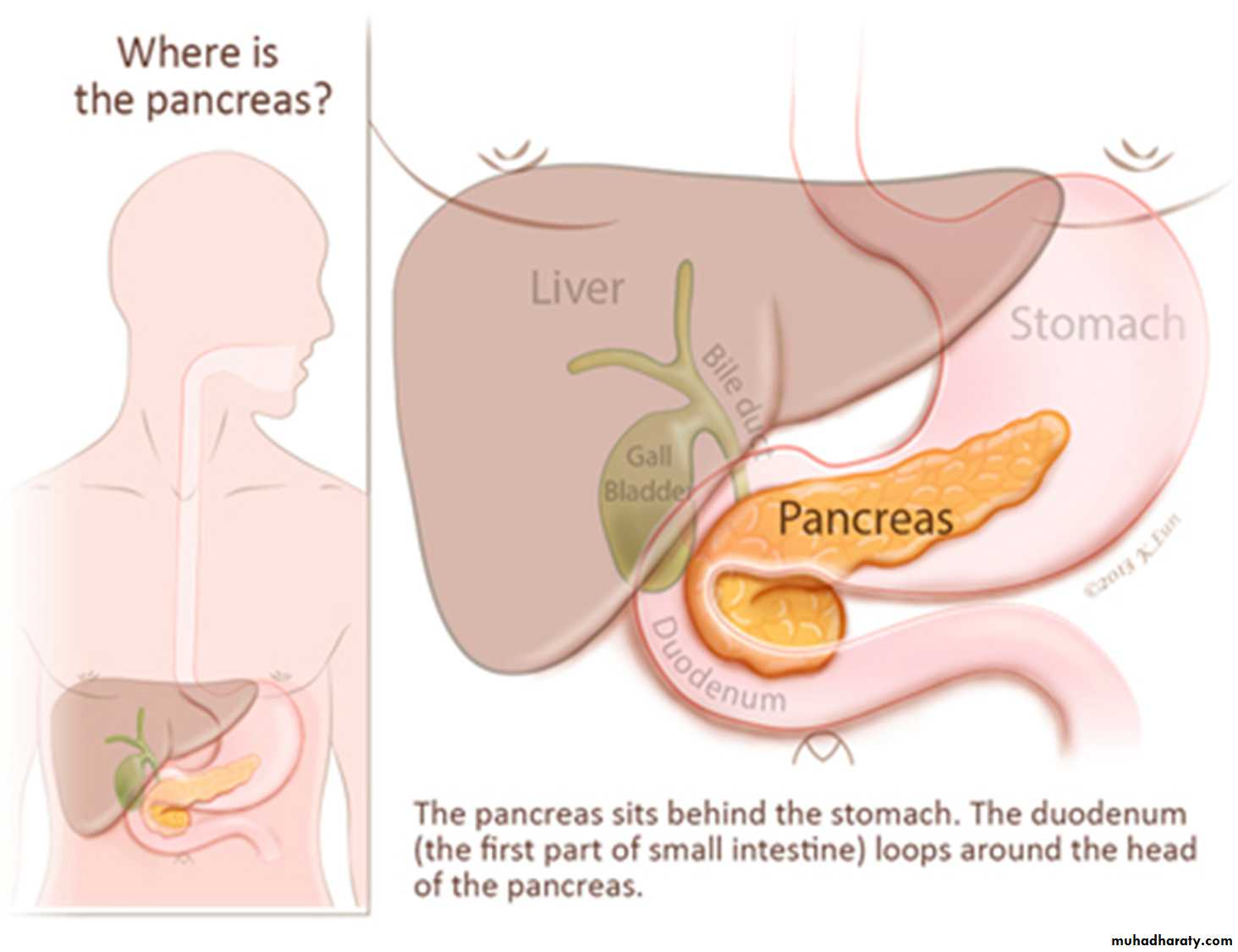 The pancreas (pan= all , kreas = flesh) is a gland that is partly exocrine and partly endocrine. The exocrine part secretes the digestive pancreatic juice, and the endocrine part secretes hormones, eg. Insulin.It is soft, lobulated and elongated organ.