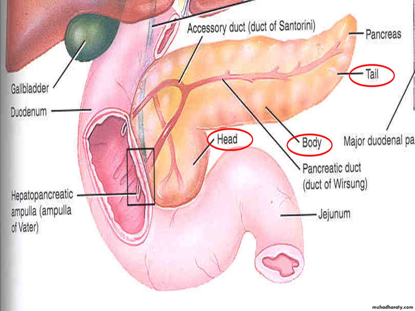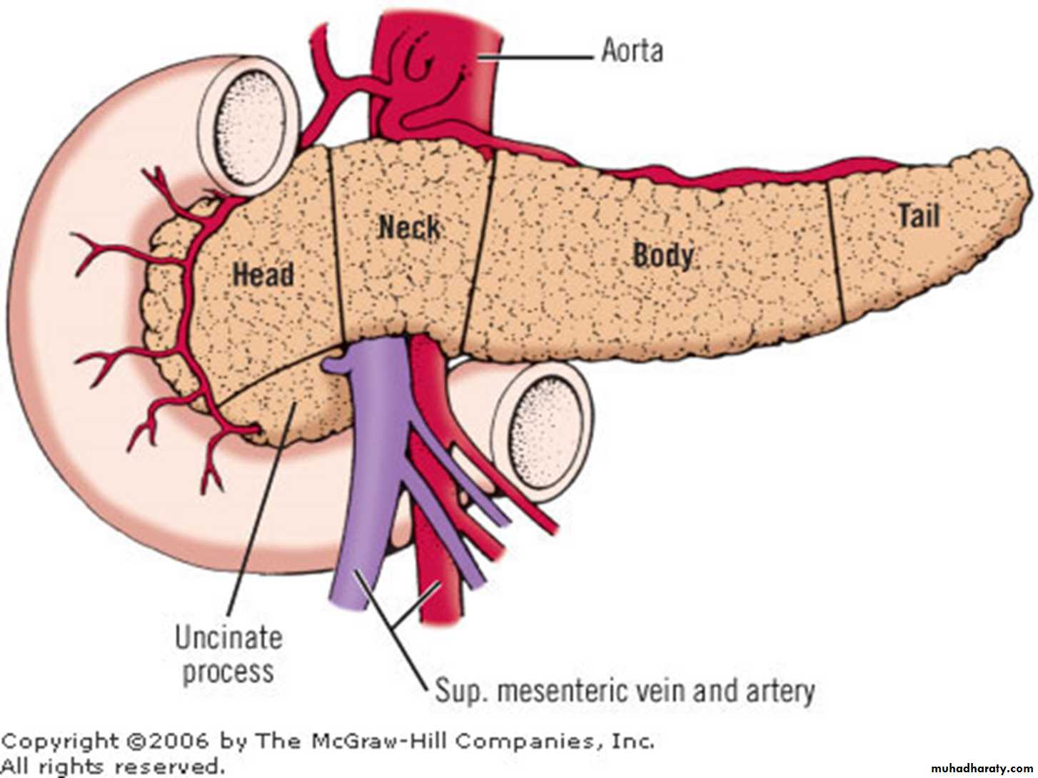 The head is enlarged and lies within the concavity of the duodenum.The tail reaches the hilum of the spleen.