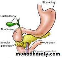 This is the result of failure of complete rotation of the ventral pancreatic bud during development, so that a ring of pancreatic tissue surrounds the second or third part of the duodenum.