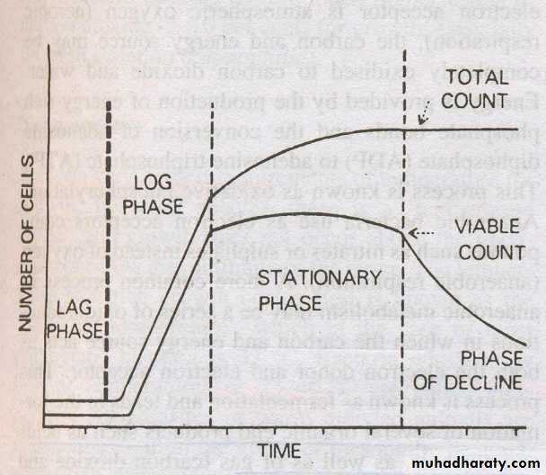 Growth curve shows 4 phases : Lag, Log or Exponential, Stationary & phase of Decline.