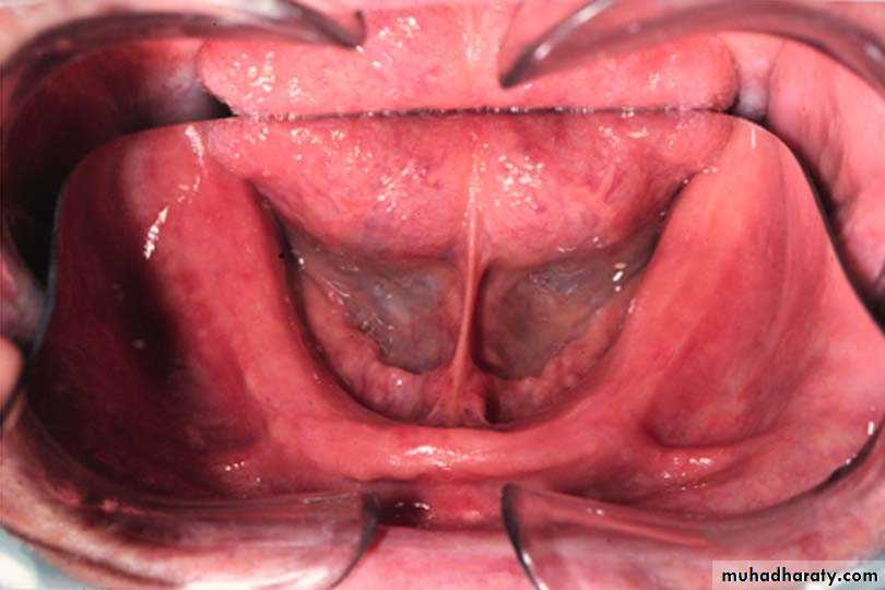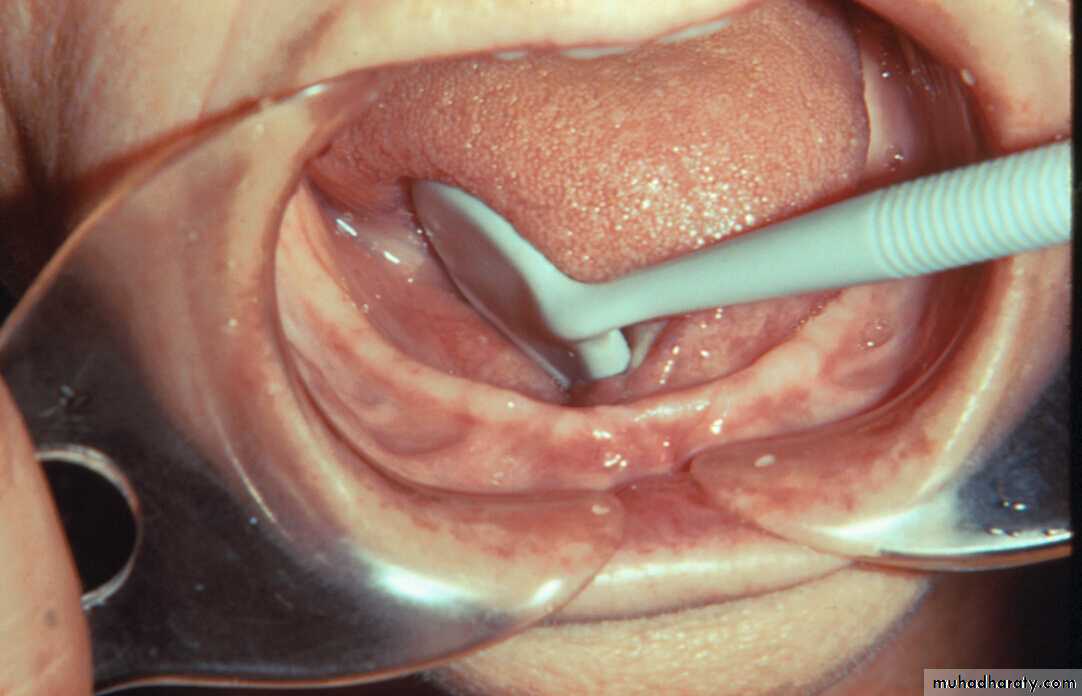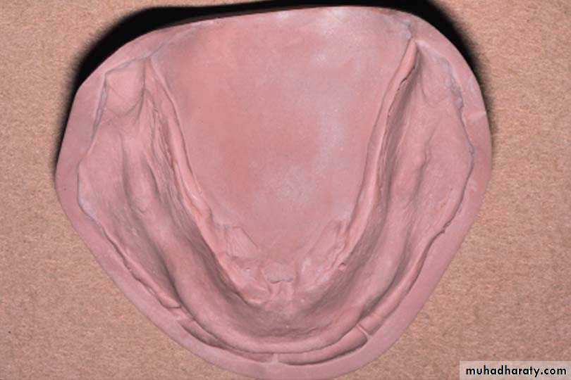 • It form the anterior attachment of tongue, it may exist as either abroad band of T or V - shape attachment, it may be close to the crest of alveolar ridge specially in sever resorption so interfere with denture retention ,relief must made, but if its attachment is low ,it is desirable to extend denture boarder posteriorly at this area.