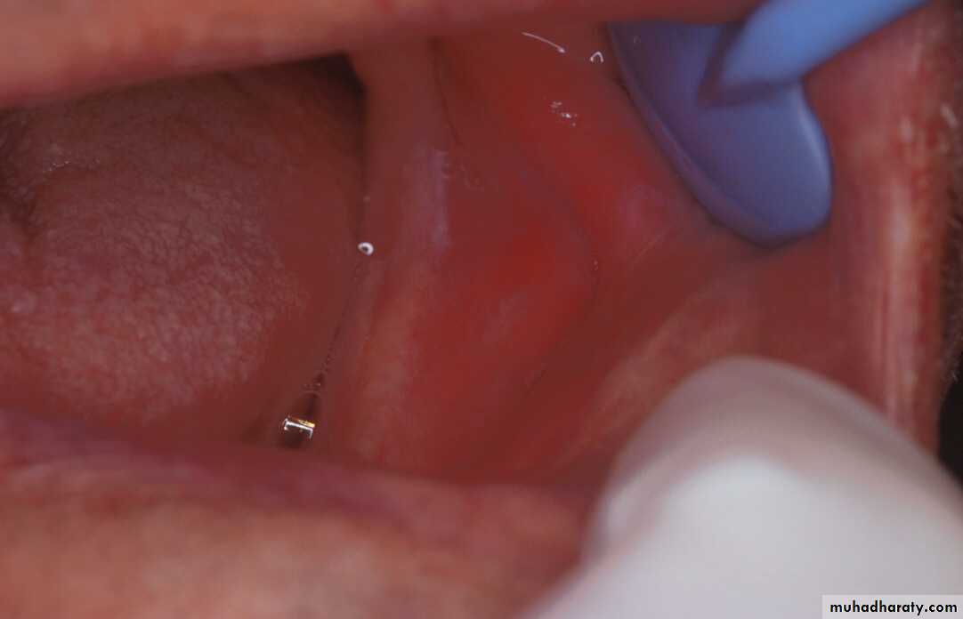 ¨ Floor of the MouthThe anterior two-thirds of the floor of the mouth is formed by the union of the right and left mylohyoid muscles in the midline. The depth of the floor of the mouth in relation to the mandibular alveolar ridge constantly changes due to factors such as mylohyoid muscle contractions, tongue movements, and swallowing activities. The posterior one-third of the lingual sulcus area is called the retromylohyoid space; distally, the area is shaped by the palatoglossus muscle.