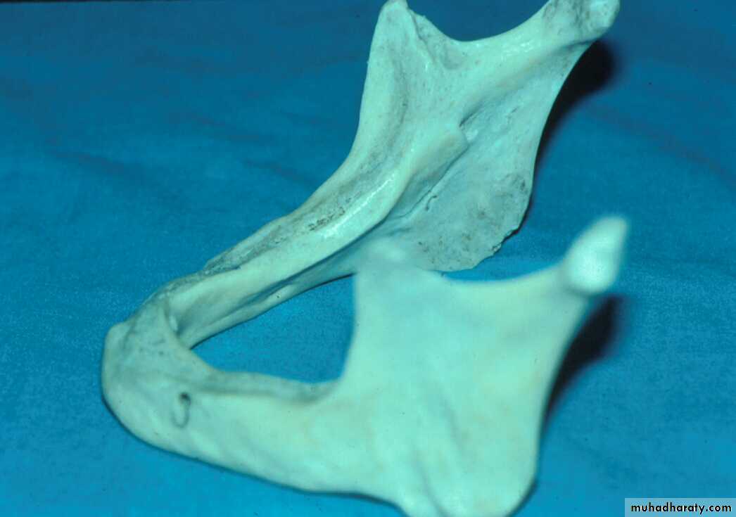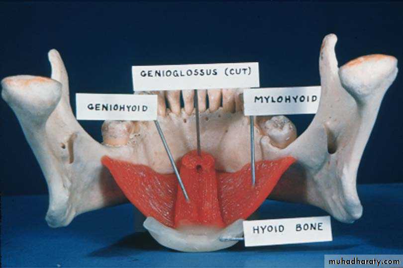 Mylohyoid Ridge. Located on the internal surface of the mandible, the mylohyoid ridge occupies a position similar to the external oblique ridge on the external surface. The mylohyoid ridge passes forward and downward from the internal aspects of the ramus onto the body of the mandible and fades out near the midline. This ridge serves as the lateral line of origin for the mylohyoid muscle (the mylohyoid muscle forms the major portion of the floor of the mouth).Genial Tubercles. Slightly above the lower border of the mandible in the midline, the bone is elevated to a more or less sharply defined prominence forming the genial tubercles.