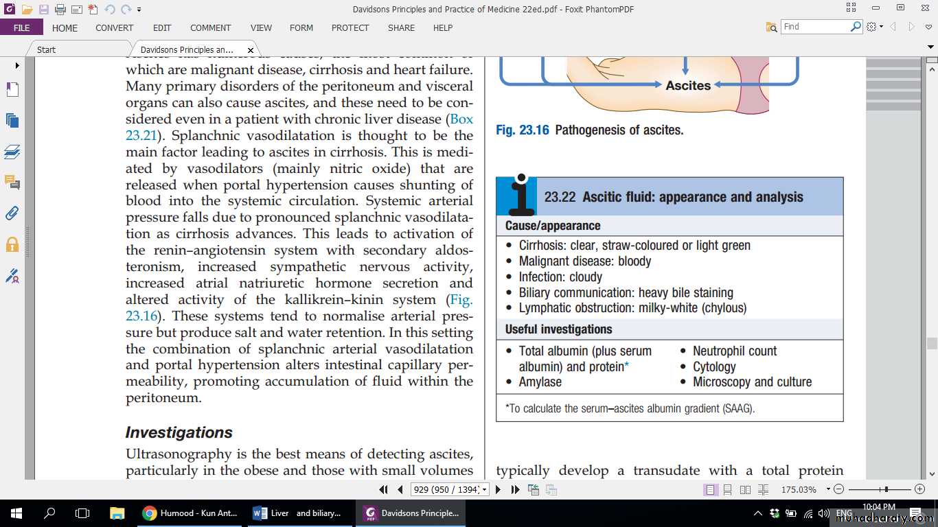 Measurement of the protein concentration and the serum–ascites albumin gradient (SAAG) are used to distinguish a transudate from an exudate. Cirrhotic patients typically develop a transudate with a total protein concentration below 25 g/L and relatively few cells. However, in up to 30% of patients, the total protein concentration is more than 30 g/L. In these cases, it is useful to calculate the SAAG by subtracting the concentration of the ascites fluid albumin from the serum albumin. A gradient of more than 11 g/L is 96% predictive that ascites is due to portal hypertension. Venous outflow obstruction due to cardiac failure or hepatic venous outflow obstruction can also cause a transudative ascites, as indicated by an albumin gradient above 11 g/L but, unlike in cirrhosis, the total protein content is usually above 25 g/L.