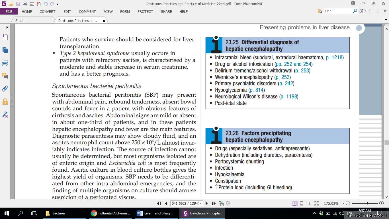 Spontaneous bacterial peritonitis (SBP) may present with abdominal pain, rebound tenderness, absent bowel sounds and fever in a patient with obvious features of cirrhosis and ascites. Abdominal signs are mild or absent in about one-third of patients, and in these patients hepatic encephalopathy and fever are the main features. Diagnostic paracentesis may show cloudy fluid, and an ascites neutrophil count above 250 × 106/L almost invariably indicates infection. The source of infection cannot usually be determined, but most organisms isolated are of enteric origin and Escherichia coli is most frequently found. Ascitic culture in blood culture bottles gives the highest yield of organisms. SBP needs to be differentiated from other intra-abdominal emergencies, and the finding of multiple organisms on culture should arouse suspicion of a perforated viscus. Treatment should be started immediately with broadspectrum antibiotics, such as cefotaxime or piperacillin/ tazobactam). Recurrence of SBP is common but may be reduced with prophylactic quinolones such as norfloxacin or ciprofloxacin.Only 10–20% of patients survive 5 years from the first appearance of ascites due to cirrhosis. The outlook is not universally poor, however, and is best in those with well-maintained liver function and a good response to therapy. The prognosis is also better when a treatable cause for the underlying cirrhosis is present or when a precipitating cause for ascites, such as excess salt intake, is found. The mortality at 1 year is 50% following the first episode of bacterial peritonitis.