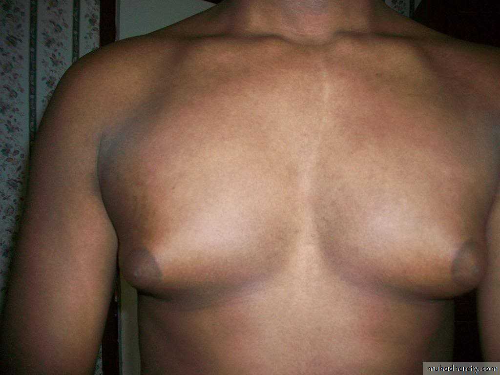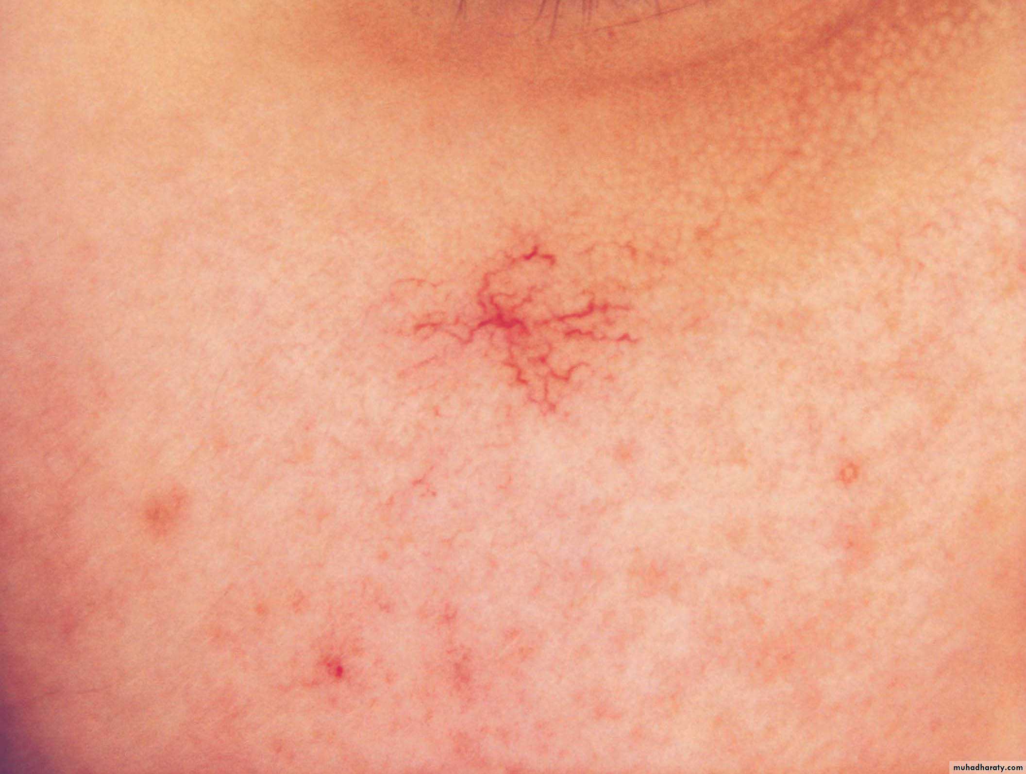 Spider telangiectasias occur and comprise a central arteriole (which occasionally raises the skin surface), from which small vessels radiate. They vary in size from 1 to 2 mm in diameter, and are usually found only above the nipples. One or two small spider telangiectasias may be present in about 2% of healthy people and may occur transiently in greater numbers in the third trimester of pregnancy, but otherwise they are a strong indicator of liver disease. Florid spider telangiectasia, gynaecomastia and parotid enlargement are most common in alcoholic cirrhosis.