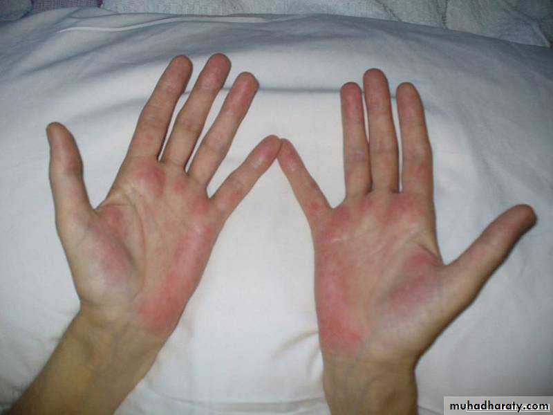 Palmar erythema can be seen early in the disease, but is of limited diagnostic value, as it occurs in many other conditions associated with a hyperdynamic circulation, including normal pregnancy, as well as being found in some healthy people.