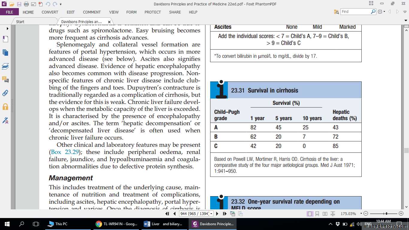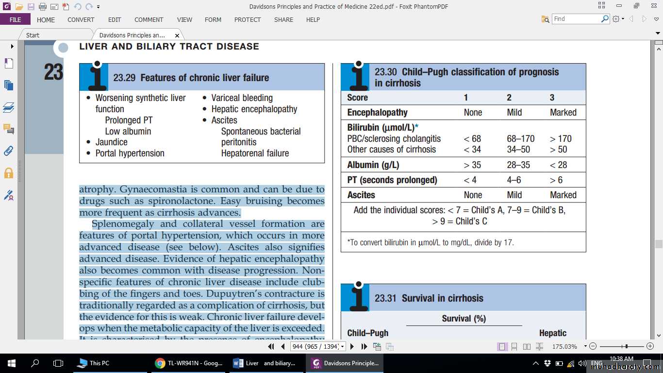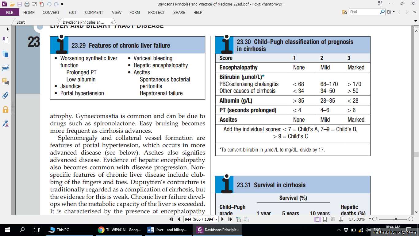 • The overall prognosis in cirrhosis is poor. Many patients present with advanced disease and/or serious complications that carry a high mortality. Overall, only 25% of patients survive 5 years from diagnosis but, where liver function is good, 50% survive for 5 years and 25% for up to 10 years. The prognosis is more favourable when the underlying cause of the cirrhosis can be corrected, as in alcohol misuse, haemochromatosis or Wilson’s disease. Laboratory tests give only a rough guide to prognosis in individual patients. Deteriorating liver function, as evidenced by jaundice, ascites or encephalopathy, indicates a poor prognosis unless a treatable cause such as infection is found. Increasing bilirubin, falling albumin (or an albumin concentration < 30 g/L), marked hyponatraemia (< 120 mmol/L) not due to diuretic therapy, and a prolonged PT are all bad prognostic features.