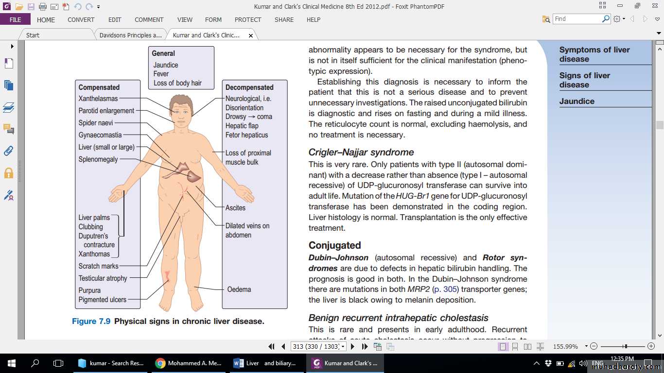 Nonspecific features of chronic liver disease include clubbing of the fingers and toes. Dupuytren’s contracture is traditionally regarded as a complication of cirrhosis, but the evidence for this is weak. Chronic liver failure develops when the metabolic capacity of the liver is exceeded. It is characterised by the presence of encephalopathy and/or ascites. The term ‘hepatic decompensation’ or ‘decompensated liver disease’ is often used when chronic liver failure occurs. Other clinical and laboratory features may be present; these include peripheral oedema, renal failure, jaundice, and hypoalbuminaemia and coagulation abnormalities due to defective protein synthesis.