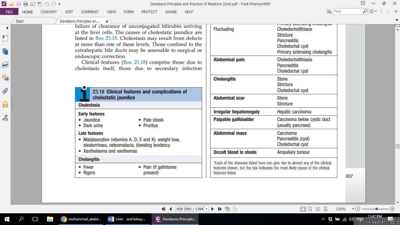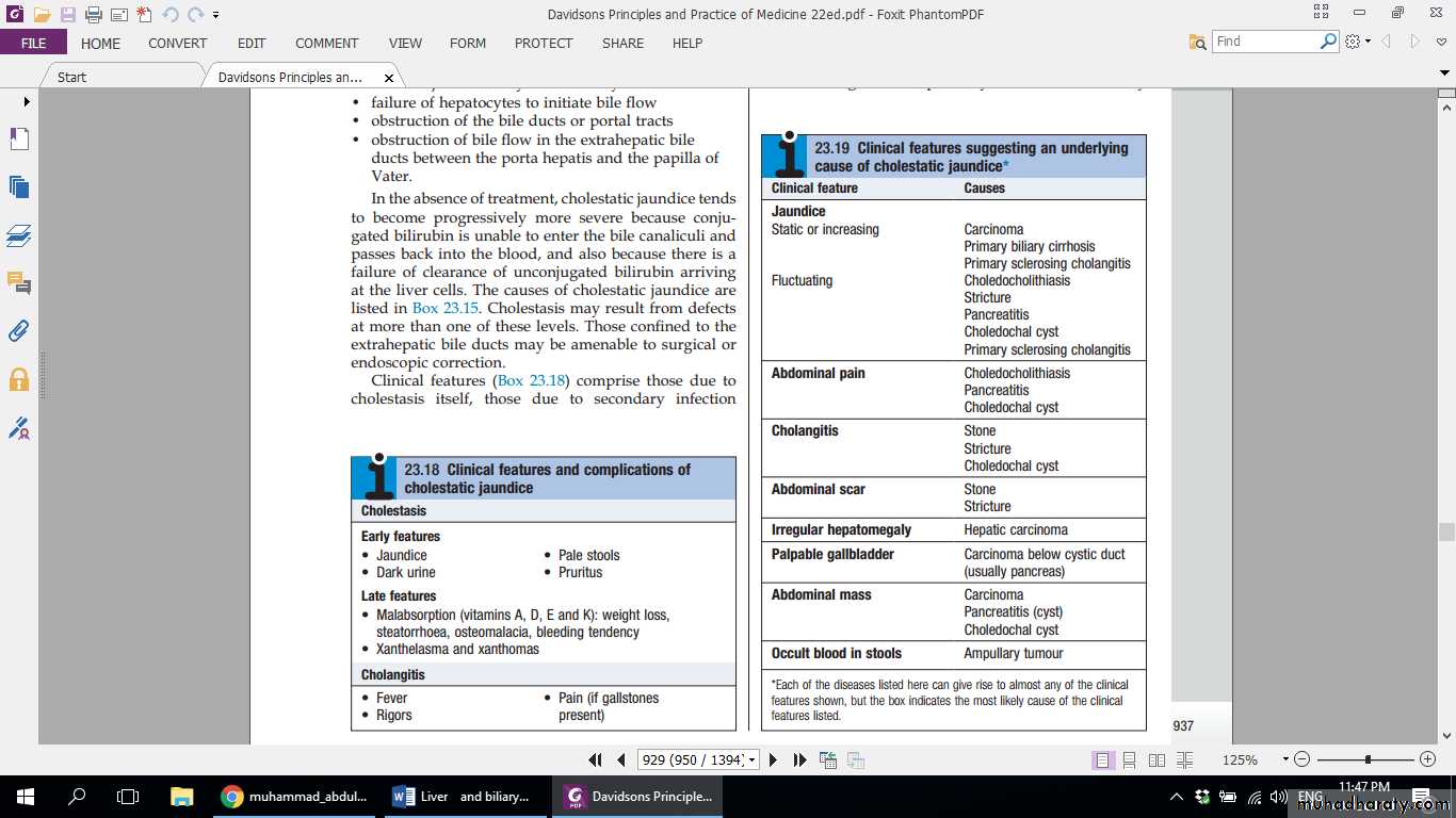 • Clinical features comprise those due to cholestasis itself, those due to secondary infection (cholangitis) and those of the underlying condition. Obstruction of the bile duct drainage due to blockage of the extrahepatic biliary tree is characteristically associated with pale stools and dark urine. Pruritus may be a dominant feature and can be accompanied by skin excoriations. Peripheral stigmata of chronic liver disease are absent. If the gallbladder is palpable, the jaundice is unlikely to be caused by biliary obstruction due to gallstones, probably because a chronically inflamed stone-containing gallbladder cannot readily dilate. This is Courvoisier’s Law, and suggests that jaundice is due to a malignant biliary obstruction (e.g. pancreatic cancer). Cholangitis is characterised by ‘Charcot’s triad’ of jaundice, right upper quadrant pain and fever. Cholestatic jaundice is characterised by a relatively greater elevation of ALP and GGT than the aminotransferases. Ultrasound is indicated to determine whether there is evidence of mechanical obstruction and dilatation of the biliary tree.