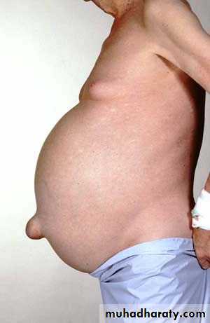 • eversion of the umbilicus, herniae, abdominal striae, divarication of the recti and scrotal oedema. Dilated superficial abdominal veins may be seen if the ascites is due to portal hypertension