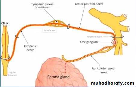 The parasympathetic component of the glossopharyngeal nerve (CN IX) supplies presynaptic secretory fibers to the otic ganglion . the postsynaptic parasympathetic fibers are conveyed from the ganglion to the gland by the auriculotemporal nerve (parasympathetic secretomotor supply arises from the glossopharyngeal nerve , the nerve reach the gland via the tympanic branch, the lesser petrosal nerve , the otic ganglion , and the auriculotemporal nerve) .