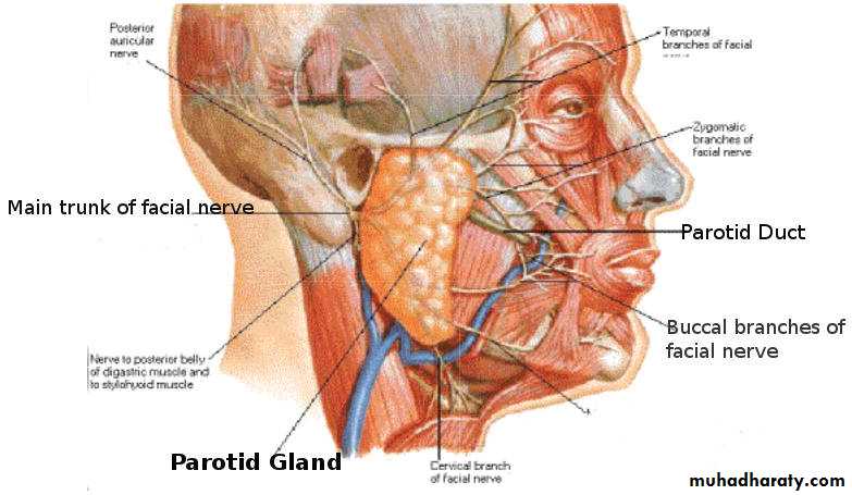 The parotid gland is the largest of three paired salivary glands. It composed mostly of serous acini. Although the facial nerve ( cn VII) is embedded within the parotid gland , the branches extending from the gland to innervate the muscles of facial expression are divides the gland into superficial and deep lobes.