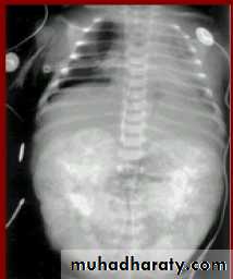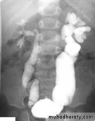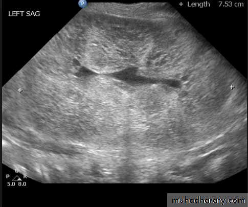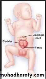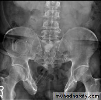 (bladder extrophy) :bladder located at low position & plain x-ray shows separation of symphysis pubis .