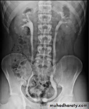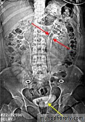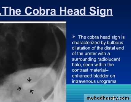 - There is rounded or elliptical dilatation of lower end of ureter with thin linear filling defect around it , resembling (cobra head appearance),