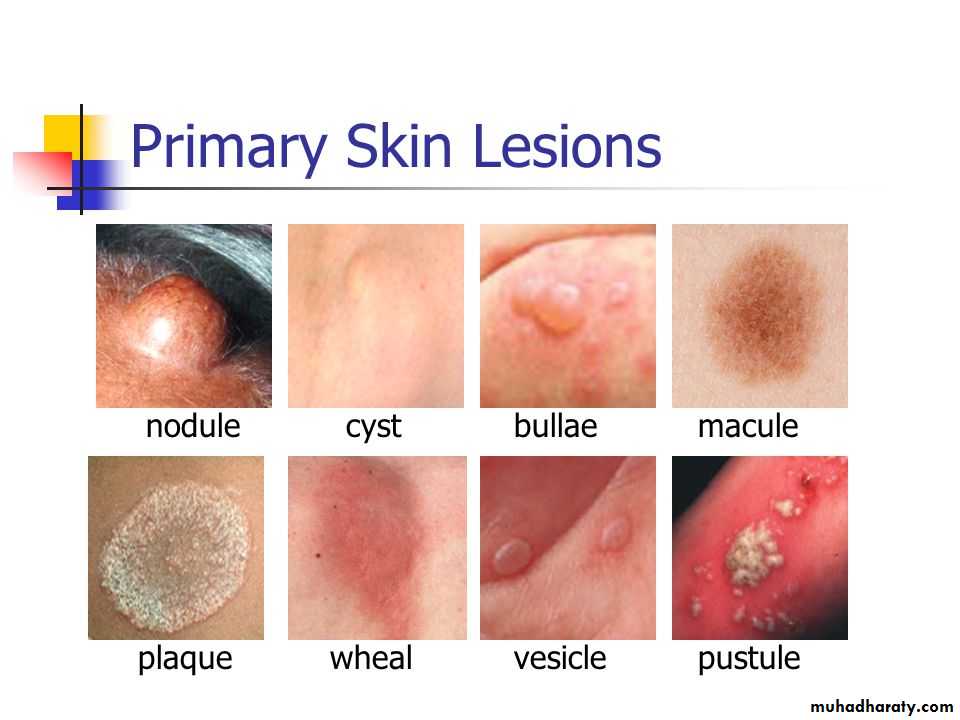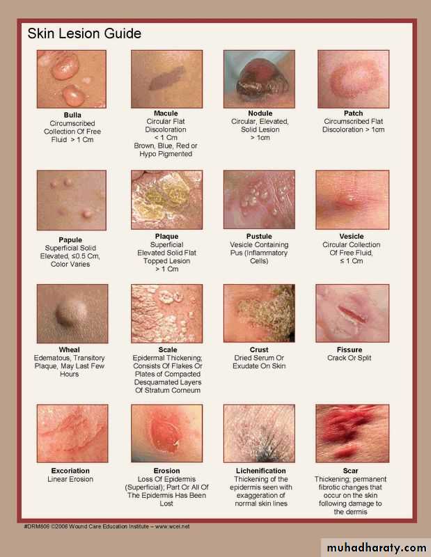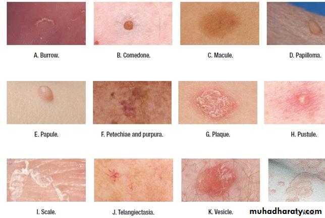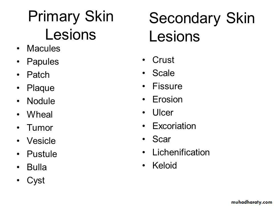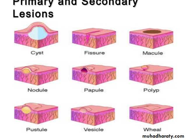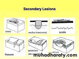 a. Primary lesions: (original lesions ) produced by the disease it selfb. Secondary Lesions: the primary lesions continue to develop or may be regress, or if it is subjected to trauma , or due to the effect of itching , infection , or to the effect of treatment