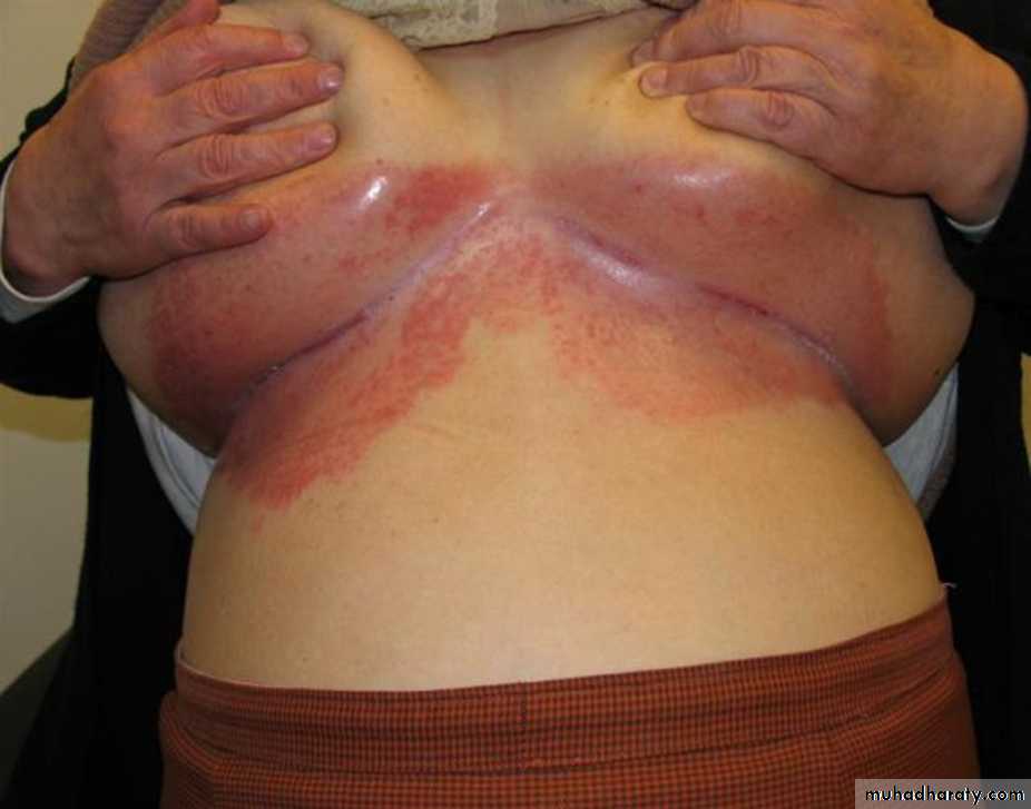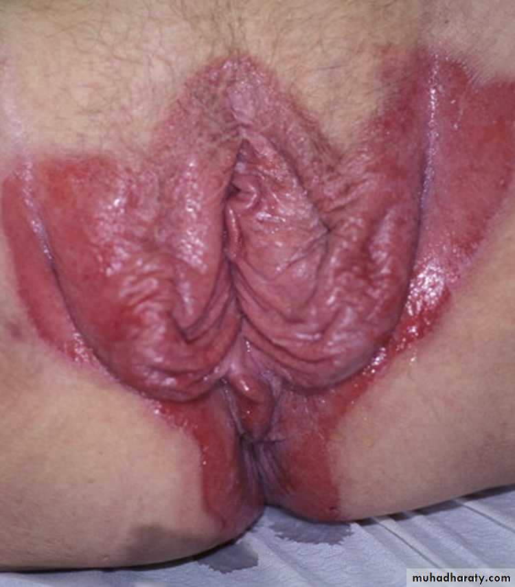 The gluteal fold, axillae, groin, submammary folds, retroauricular fold, and the glans of the uncircumcised penis may be affected.The deep red, smooth, glistening plaques may extend to and stop at the junction of the skin folds, as with intertrigo or Candida infections as ddx.