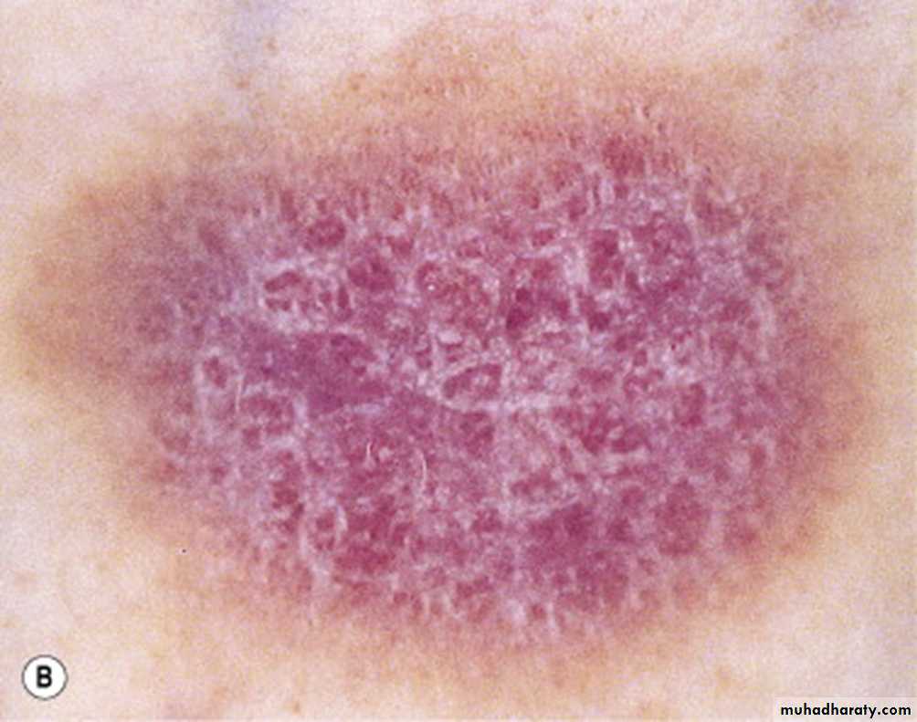 Close inspection of the surface shows a lacy, reticular pattern of crisscrossed, whitish lines (wickham’s striae) that can be accentuated by a drop of immersion oil.