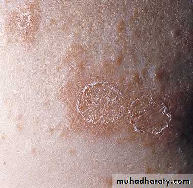 Typically 1- to 2-cm oval plaques appear, a fine, wrinkled, tissue-like scale remains attached within the border of the plaque, giving the characteristic ring of scale, called collarette scale.The long axis of the oval plaques is oriented along skin lines.