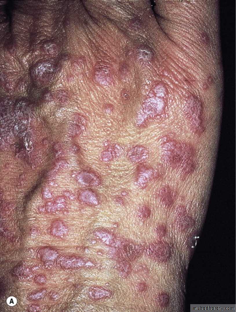 Individual lesions are salmon pink in whites and hyperpigmented in blacks.
