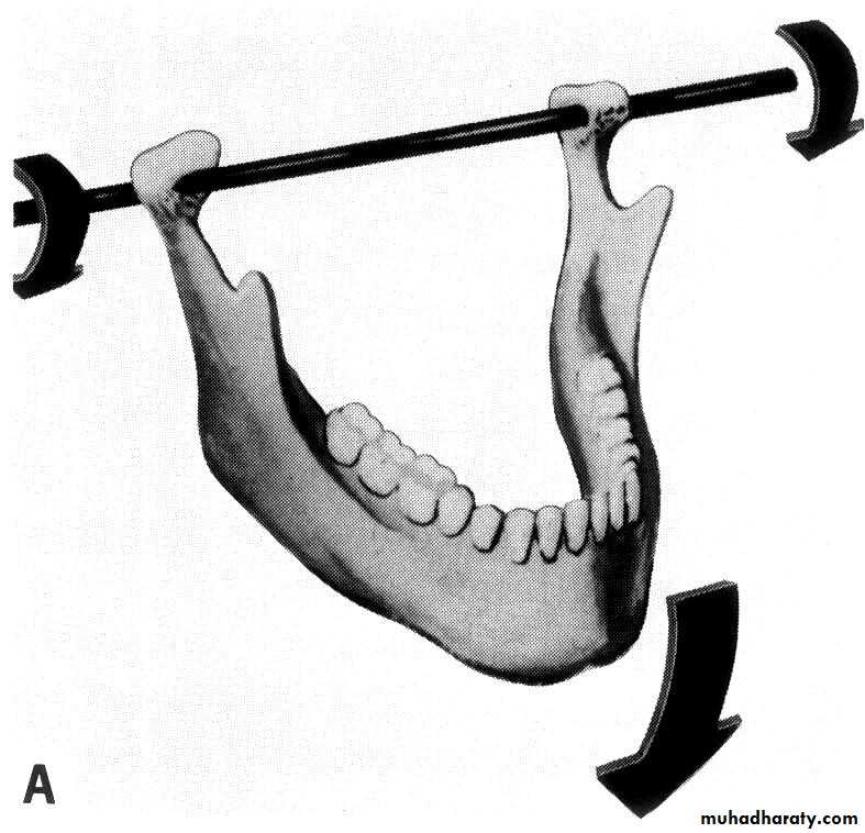 • A device, with adjustable side arms, which is attached to the mandible and used to locate the retruded hinge axis.• ( Mandibular Face Bow )