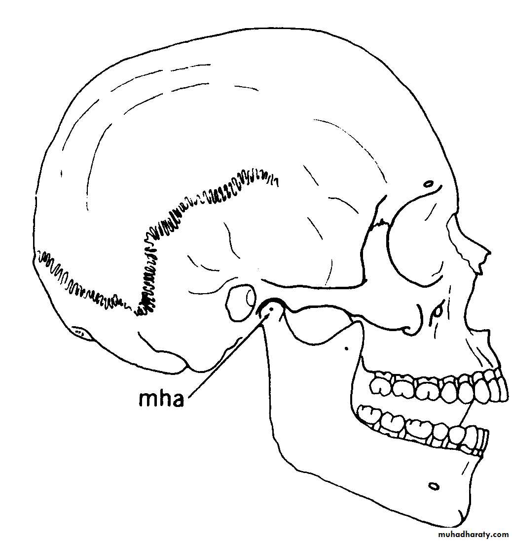• 11 mm anterior to the tragus• of the ear on an imaginary line between the outer canthus of the eye and the upper surface of the tragus of the ear or lies 13 mm in front of the anterior margin of the external auditory meatus.
