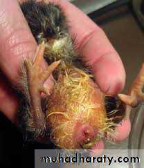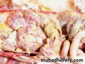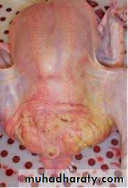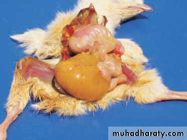 In severe cases the body wall and overlying skin undergo lysis and are wet and dirty. These birds are referred to as “mushy” chicks or poults.