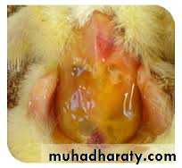 The yolk sac is typically distended because yolk has not been absorbed and inflammatory products have been added. Yolk is abnormal in color, consistency, and smell, and may contain visible exudate. Blood vessels of the yolk sac are often prominent