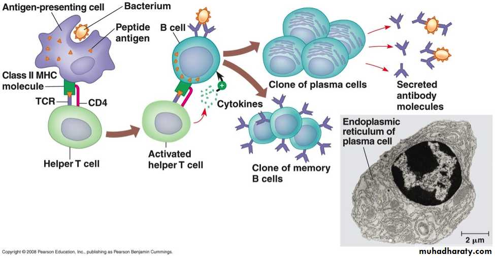 – Production of antibodies: The primary function of B cells is to produce antibodies. After stimulation by antigen and other signals, B cells develop into plasma cells. These cells secrete antibodies like IgG, IgM, IgD, IgA and IgE. Initially, the first antibody produced by the plasma cell is IgM and later, other antibodies like IgG, IgA etc