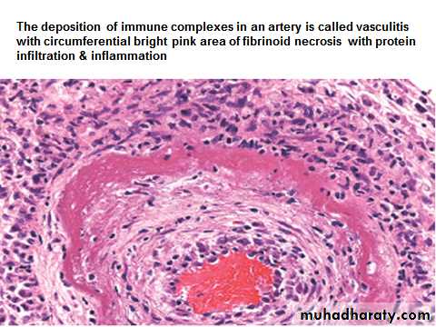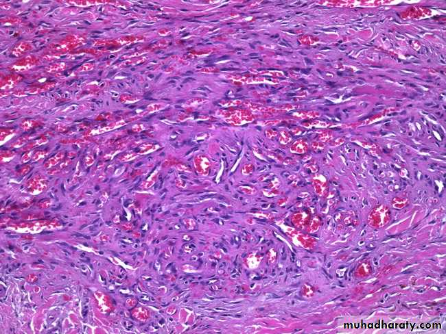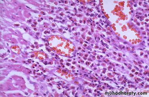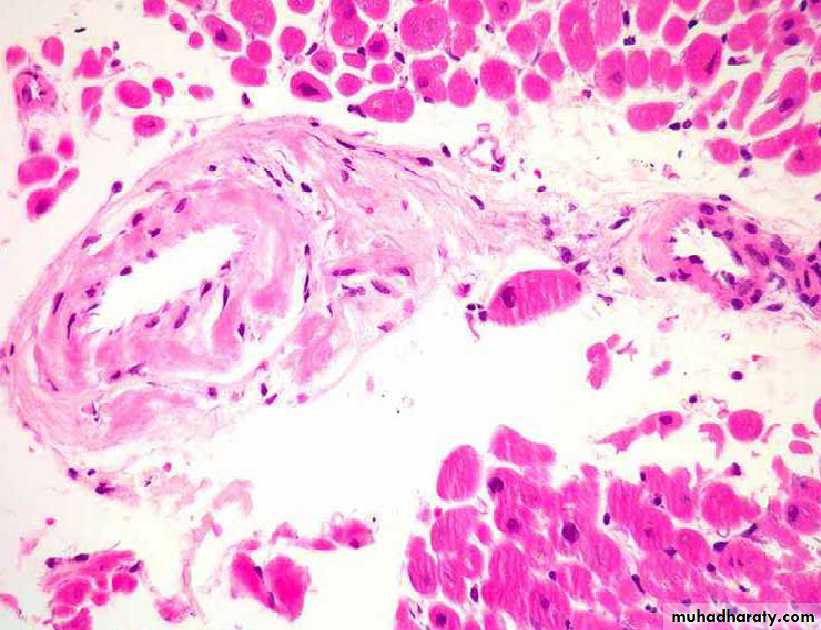 In the heart, amyloid deposits begin to accumulate within the myocardium between muscle fibers & in the wall of blood vessels as seen by H&E as amorphous eosinophilic hyaline (right) & congo red stains as red deposits (left)H&E stain