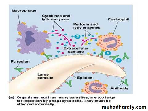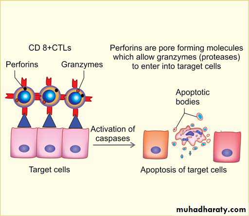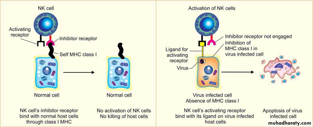 1- Antibody-dependent cellular cytotoxicity (ADCC): NK cells bear (CD16) is an Fc receptor for IgG, and it confers on NK cells the ability to lyse IgG-coated target cells.2- Perforin-granzymes system : NK cells have a variety of surface receptors for MHC (major histocompatibility complex) class I. These are activating and inhibitory receptors.