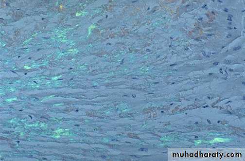 Note the yellow-green birefringence of amyloid in the heart with polarized microscope