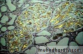 Amyloidosis of kidney- polarized light, the Congo red stained amyloid shows apple-green birefringence.
