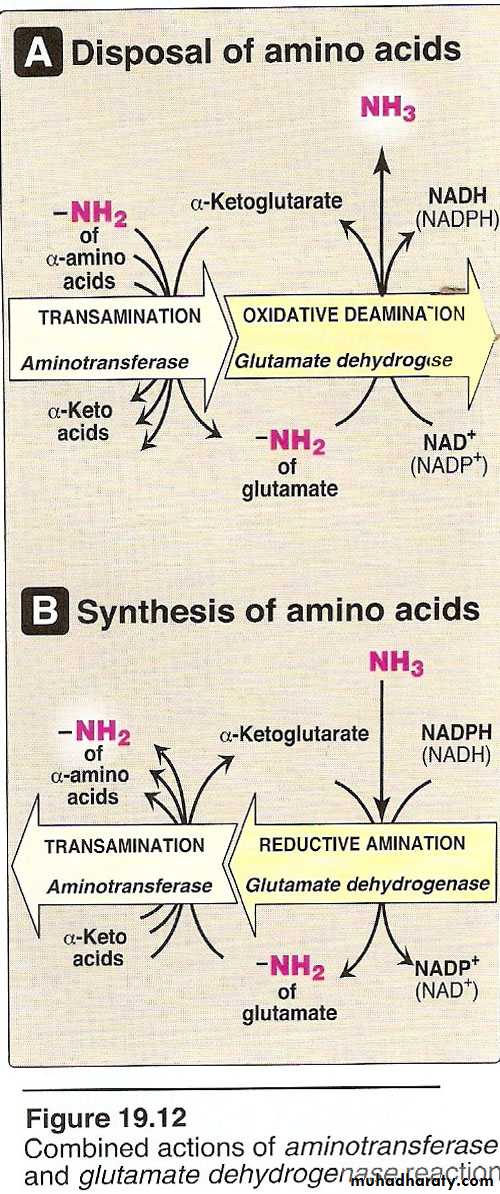 1)Glutamate rapidly undergoes oxidative deamination catalyzed by glutamate dehydrogenase to liberate ammonia using NAD or NADP as a coenzyme.