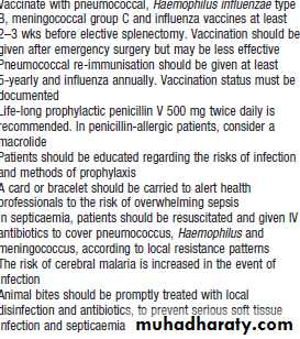 1. Performed only when necessaryi.e moderate to severe hemolysis with complication (pts who required blood transfusion,gall stones)2. Should be avoided in pts younger than 6 years of age ,associated risk (fatal pneumonia, sepsis)3. May be performed with cholecystectomy to decrease the amount of hemolysis and the risk of gall stones development.Management of the splenectomised patient: