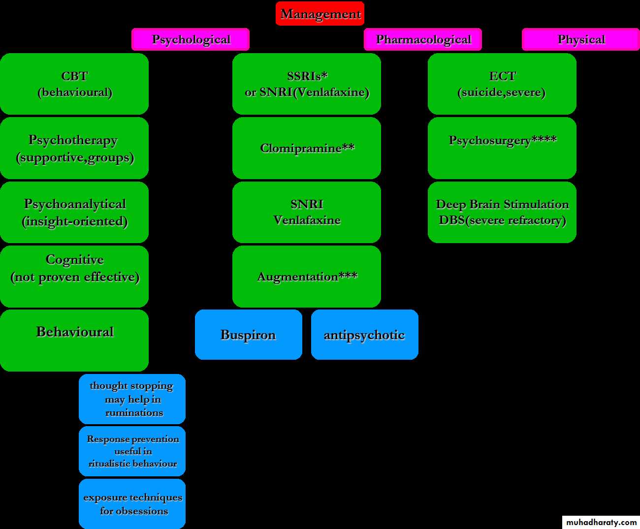 *Antidepressants SSRIs: fluoxetine, fluvoxamine, sertraline, or paroxetine should be considered first-line (no clear superiority of any one agent, high doses usually needed (e.g. 40-60 mg fluoxetine, allow at least 12 wks for treatment response, regard as long-term).