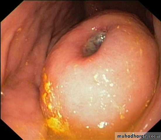 the ckit proto-oncogene, which encodes a tyrosine kinase receptor. These tumours are usually benign and asymptomatic, but may occasionally be responsible for dyspepsia, ulceration and gastrointestinal bleeding. Endoscopically the lesion seen as subepithelial mass with occasional umbilication (see the figure)