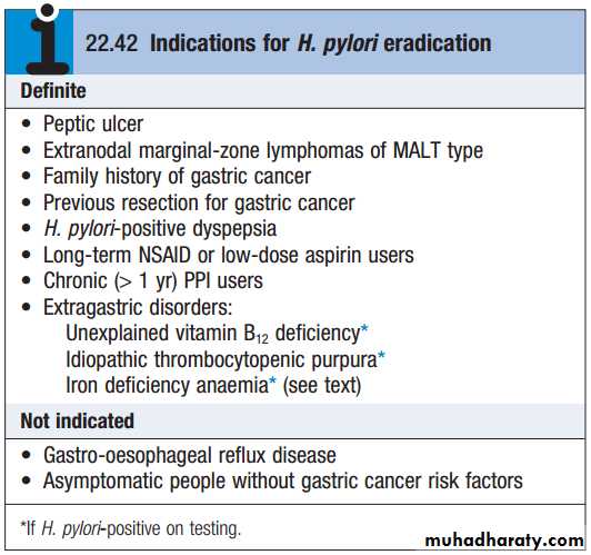 Management: The most important elements are ❶explanation and reassurance. Possible psychological factors should be explored and the concept of psychological influences on gut function should be explained. ❷Idiosyncratic and restrictive diets are of little benefit, but smaller portions and fat restriction may help. ❸Up to 10% of patients benefit from H. pylori eradication therapy and this should be offered to infected patients. Eradication also removes a major risk factor for gastric cancer but at the cost of a small risk of side effects and worsening symptoms of underlying gastro esophageal reflux disease. Drug treatment is not especially successful but merits trial. ❹Antacids, such as hydrotalcite, are sometimes helpful. ❺Prokinetic drugs, such as metoclopramide (10 mg 3 times daily) or domperidone (10–20 mg 3 times daily), may be given before meals if nausea, vomiting or bloating is prominent. Metoclopramide may induce extrapyramidal side effects, including tardive dyskinesia in young subjects. ❻H2-receptor antagonist drugs may be tried if night pain or heartburn is troublesome. ❼Low-dose tricyclic agents, such as amitriptyline, are of value in up to two-thirds. Symptoms that can be associated with an identifiable cause of stress resolve with appropriate counselling. Some patients have major psychological disorders that result in persistent or recurrent symptoms and need ❽behavioural or other formal psychotherapy.