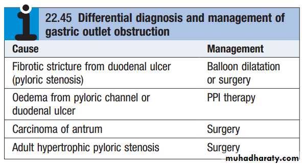 Intravenous correction of dehydration is undertaken and, in severe cases, at least 4 L of isotonic saline and 80 mmol of potassium may be necessary during the first 24 hours. In some patients, PPI drugs heal ulcers, relieve pyloric oedema and overcome the need for surgery. Endoscopic balloon dilatation of benign stenoses may be possible in some patients, but in others partial gastrectomy is necessary, although this is best done after a 7-day period of nasogastric aspiration, which enables the stomach to return to normal size. A gastroenterostomy is an alternative operation but, unless this is accompanied by vagotomy, patients will require long-term PPI therapy to prevent stomal ulceration.