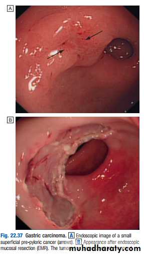 Diffuse submucosal infiltration by a scirrhous cancer (linitis plastica) is uncommon. Early gastric cancer is defined as cancer confined to the mucosa or submucosa. It is more often recognised in Japan, where widespread screening is practised. Some cases can be cured by endoscopic mucosal or submucosal resection The majority of patients (> 80%) in the West, however, present with advanced gastric cancer.