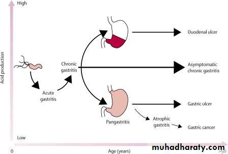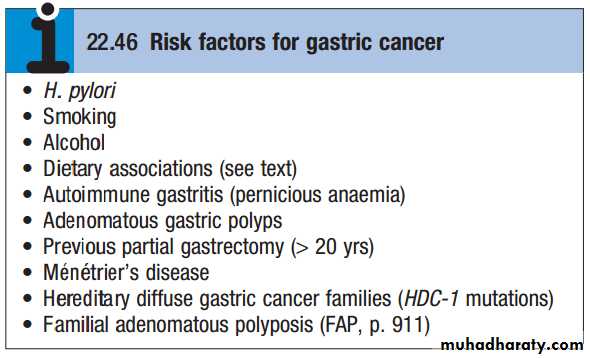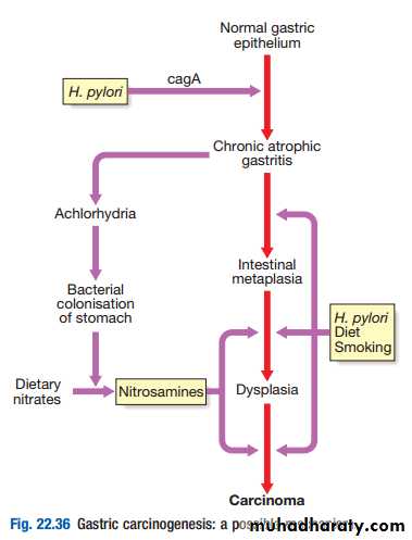 Pathophysiology: Infection with H. pylori plays a key pathogenic role. It is associated with chronic atrophic gastritis, gastric mucosal atrophy and with gastric cancer. It has been estimated that H. pylori infection may contribute to the occurrence of gastric cancer in 60–70% of cases and that acquisition of infection at an early age may be important. Although H. pylori infection is common in Africa, gastric cancer is uncommon and this enigma may be explained by lower life expectancy in this part of the world. Although the majority of H. pyloriinfected individuals have normal or increased acid secretion, a few become hypo- or achlorhydric and these people are thought to be at greatest risk. Chronic inflammation with generation of reactive oxygen species and depletion of the normally abundant antioxidant ascorbic acid are also important. There is strong evidence that H. pylori eradication, especially if achieved before irreversible pre-neoplastic changes have developed, reduces the risk of cancer development in high-risk populations and is cost-effective. Diets rich in salted, smoked or pickled foods and the consumption of nitrites and nitrates may increase cancer risk. Carcinogenic N-nitroso-compounds are formed from nitrates by the action of nitrite-reducing bacteria which colonise the achlorhydric stomach. Diets lacking fresh fruit and vegetables, as well as vitamins C and A, may also contribute. Other risk factors are