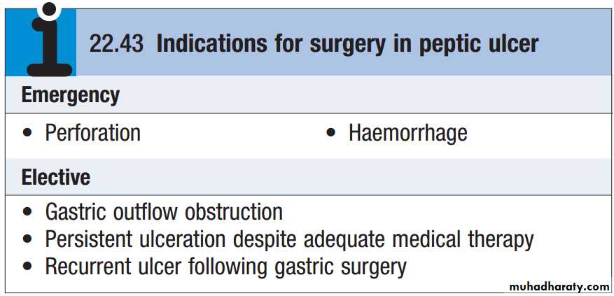 Surgery is now rarely required for peptic ulcer disease but it is needed in some cases. The operation of choice for a chronic non-healing gastric ulcer is partial gastrectomy, preferably with a Billroth I anastomosis, in which the ulcer itself and the ulcer-bearing area of the stomach are resected. The reason for this is to exclude an underlying cancer. In an emergency, ‘under-running’ the ulcer for bleeding or ‘oversewing’ (patch repair) for perforation is all that is required, in addition to taking a biopsy. For giant duodenal ulcers, partial gastrectomy using a ‘Polya’ or Billroth II reconstruction may be required.