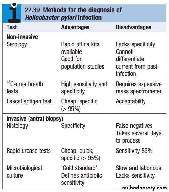 Endoscopy is the preferred investigation. Gastric ulcers may occasionally be malignant and therefore must always be biopsied and followed up to ensure healing. Patients should be tested for H. pylori infection. Some are invasive and require endoscopy; others are noninvasive. They vary in sensitivity and specificity. Breath tests or faecal antigen tests are best because of accuracy, simplicity and non-invasiveness.