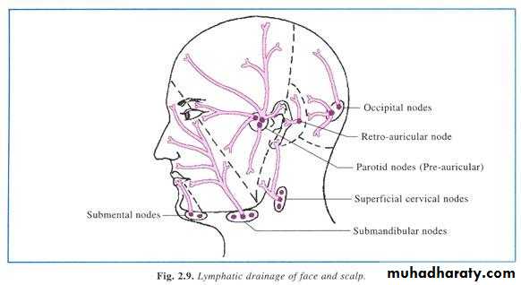 Lymph vessels in the anterior part of the scalp and forehead drain into the submandibular lymph nodes. Drainage from the lateral part of the scalp above the ear is into the superficial parotid (preauricular) nodes; lymph vessels in the part of the scalp above and behind the ear drain into the mastoid nodes. Vessels in the back of the scalp drain into the occipital nodes.The Face