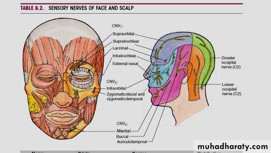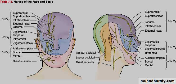 The skin of the face is supplied by branches of the three divisions of the trigeminal nerve, except for the small area over the angle of the mandible and the parotid gland , which is supplied by the greater auricular nerve (C2 and 3).A. Ophthalmic Nerve