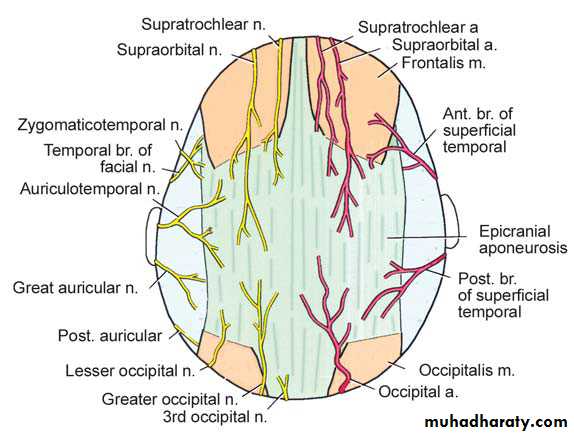 The scalp has a rich supply of blood to nourish the hair follicles, and, for this reason, the smallest cut bleeds profusely. The arteries lie in the superficial fascia. Moving laterally from the midline anteriorly, the following arteries are present:1. Supratrochlear and Supraorbital arteries, branches of the ophthalmic artery, ascend over the forehead in company with the supratrochlear and supraorbital nerves.