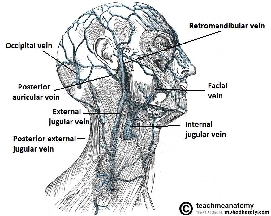 The veins to be seen in the face and parotid region are the facial vein, the superficial temporal vein, and the retromandibular vein. The retromandibular vein is formed within the upper part of the parotid gland by the union of the superficial temporal and maxillary veins. Its lower end divides, within the gland, into anterior and posterior divisions that emerge from the gland near its lower end. The posterior division, that is the main continuation of the retromandibular vein, joins the posterior auricular vein to form the external jugular vein. The anterior division joins the facial vein to form the common facial vein.The facial vein runs downwards and backwards just behind the facial artery, and receives tributaries corresponding to branches of the artery. It ends by joining the anterior division of the retromandibular vein to form the common facial vein. The common facial vein ends in the internal jugular vein.