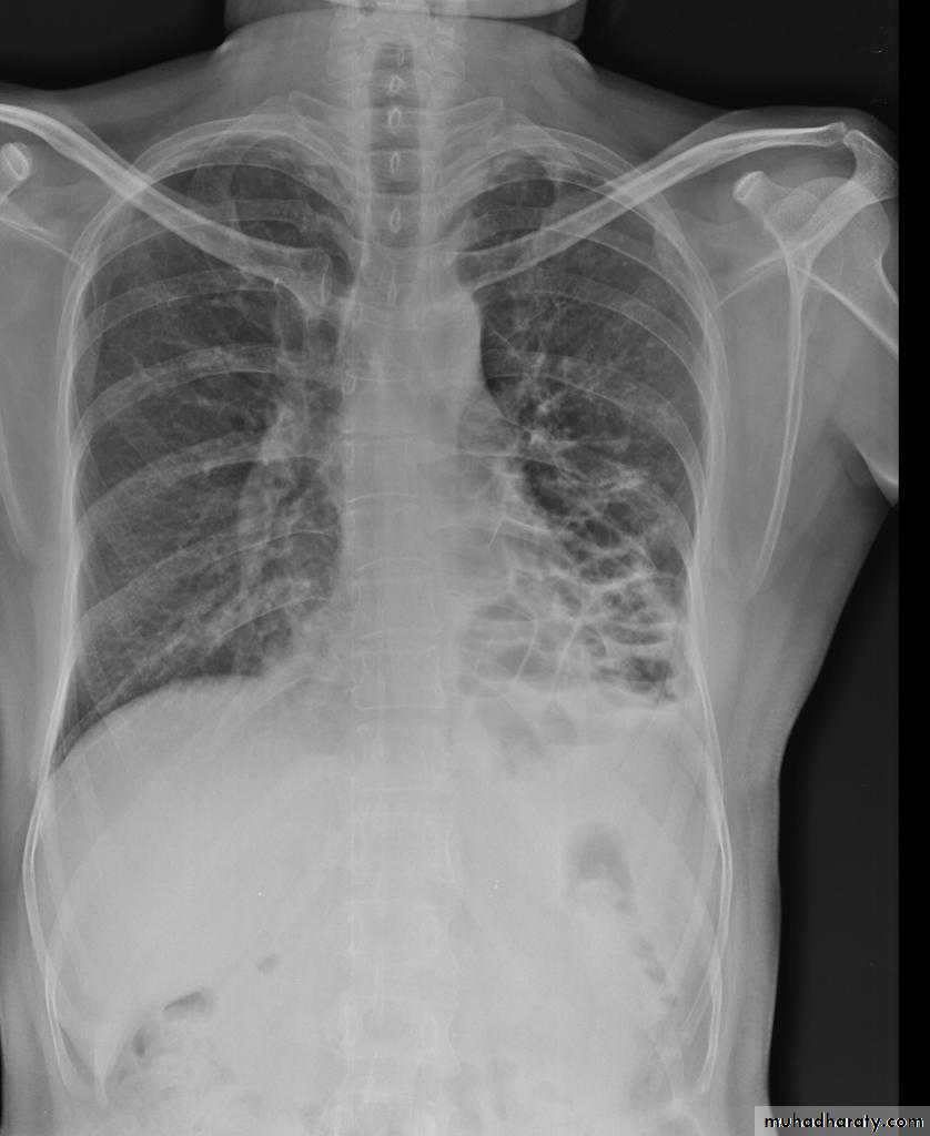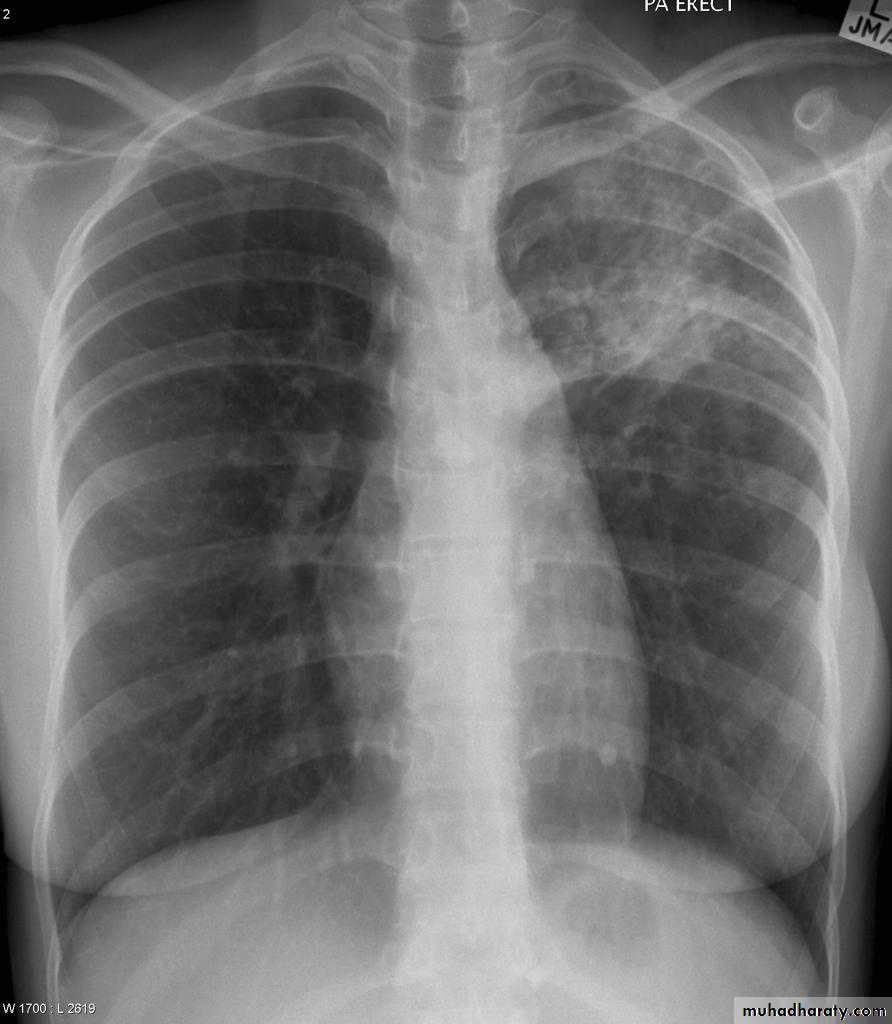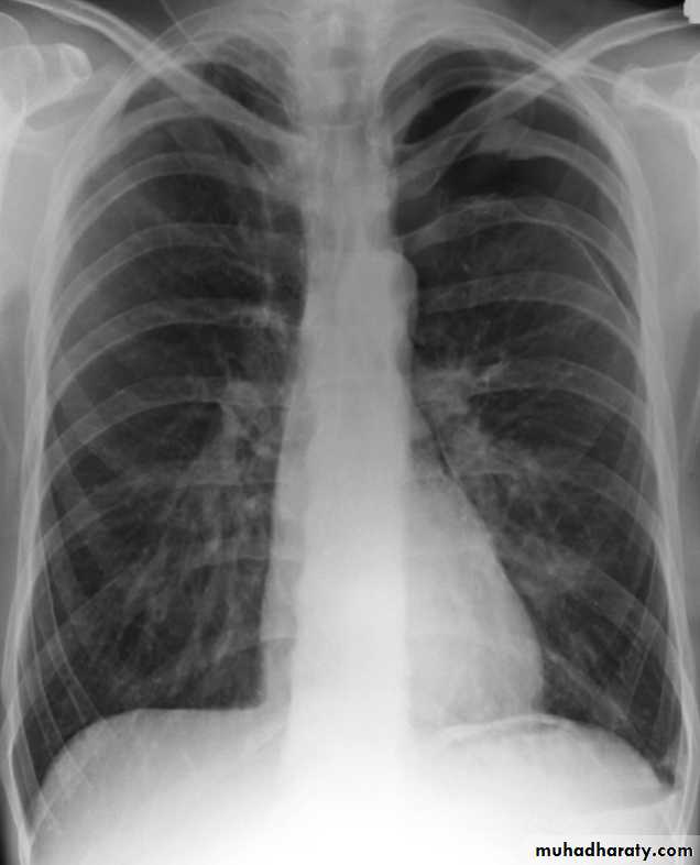 1.the initial focus of infection can be located anywhere within the lung and has non-specific appearances ranging from too small to be detectable, to patchy areas or consolidation or even lobar consolidation in RT upper or RT middle lobe . Radiographic evidence of parenchymal infection is seen in 70% of children and 90% of adults called Ghon lesion , +/- ipsilateral hilar or paratracheal Lymph adenopathy usually right sided
