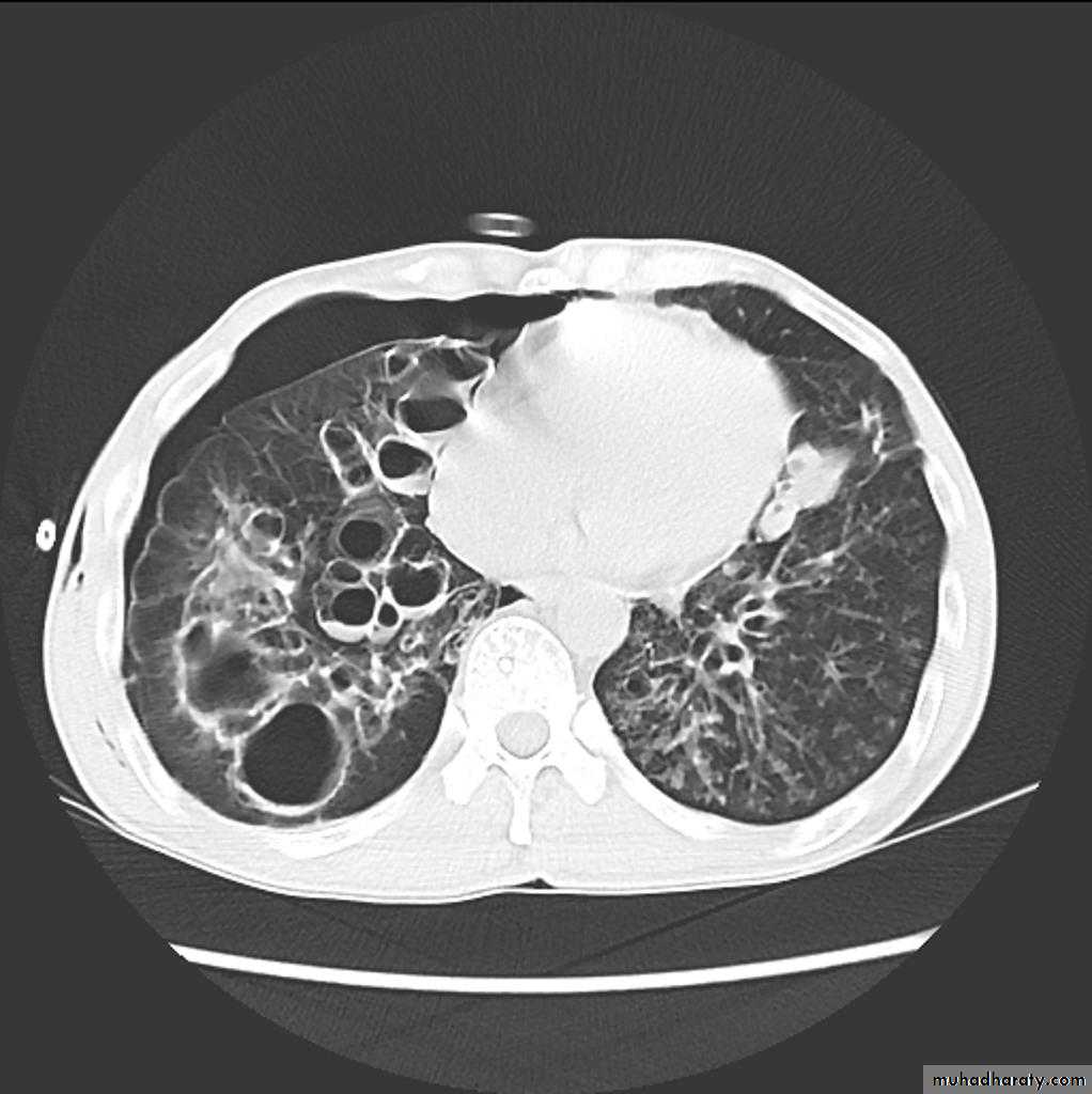 post-infective (most common)necrotising bacterial pneumonia, e.g Staph. aureus, Klebsiella, B. pertussis