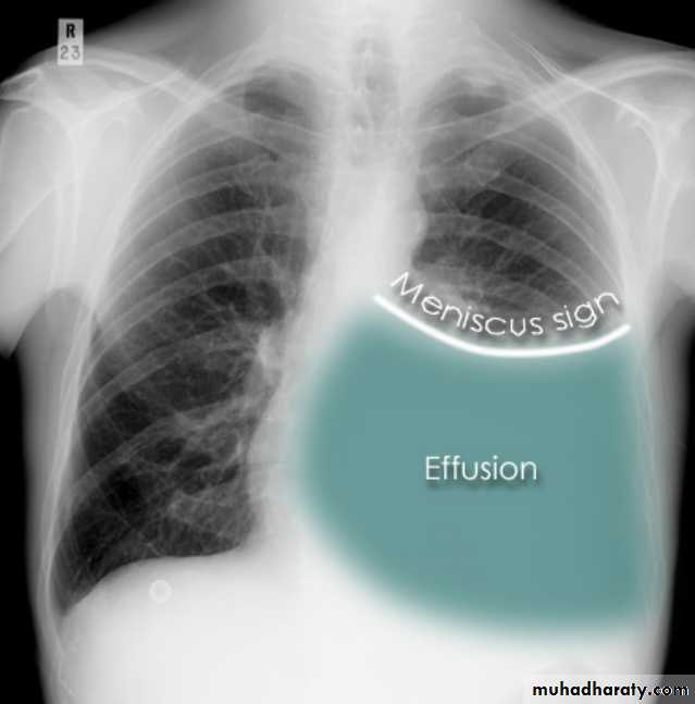 eventually a meniscus will be seen, on frontal films seen laterally and gently sloping medially (note: